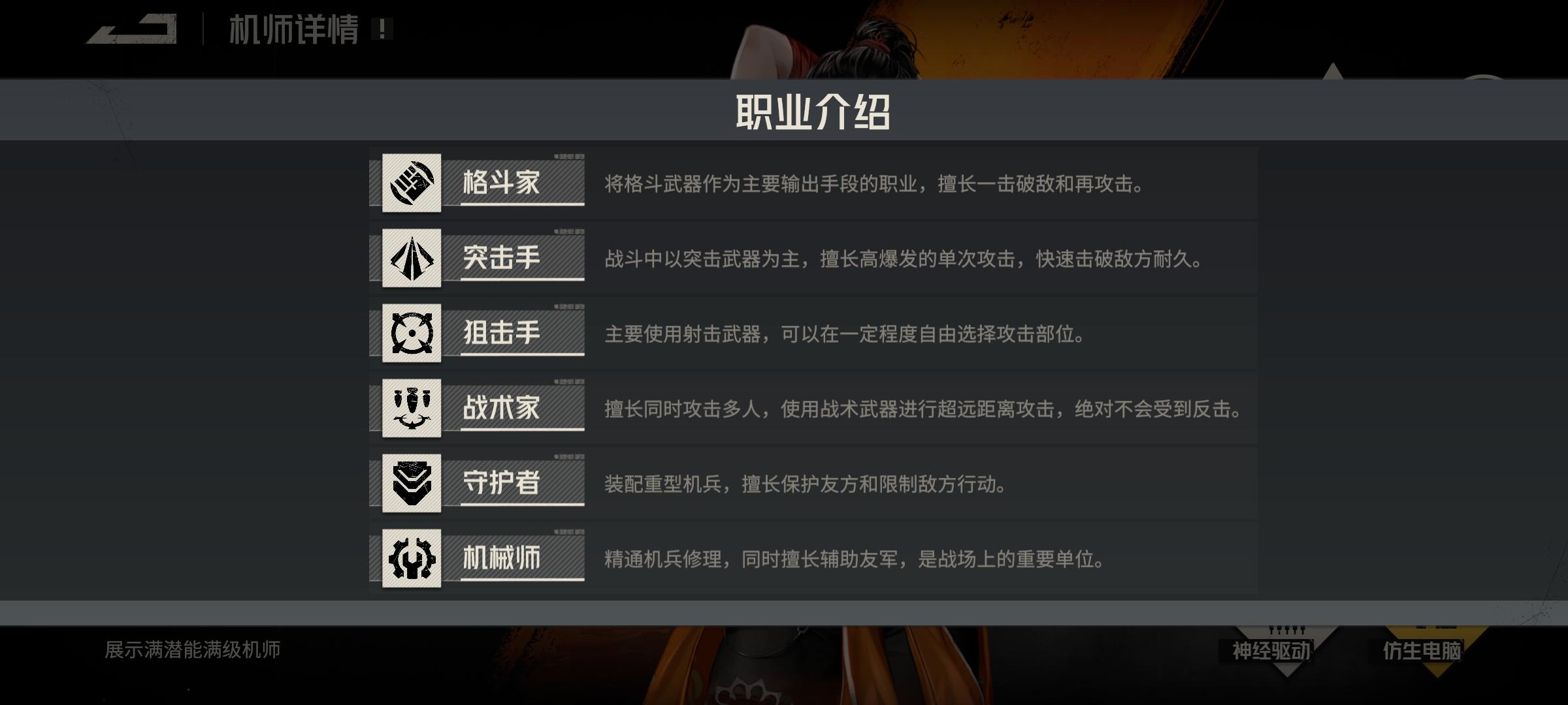类:就是职业,格斗(刺客),突击(战士),狙击(射手),战术(法师),守护(肉),机械(奶)