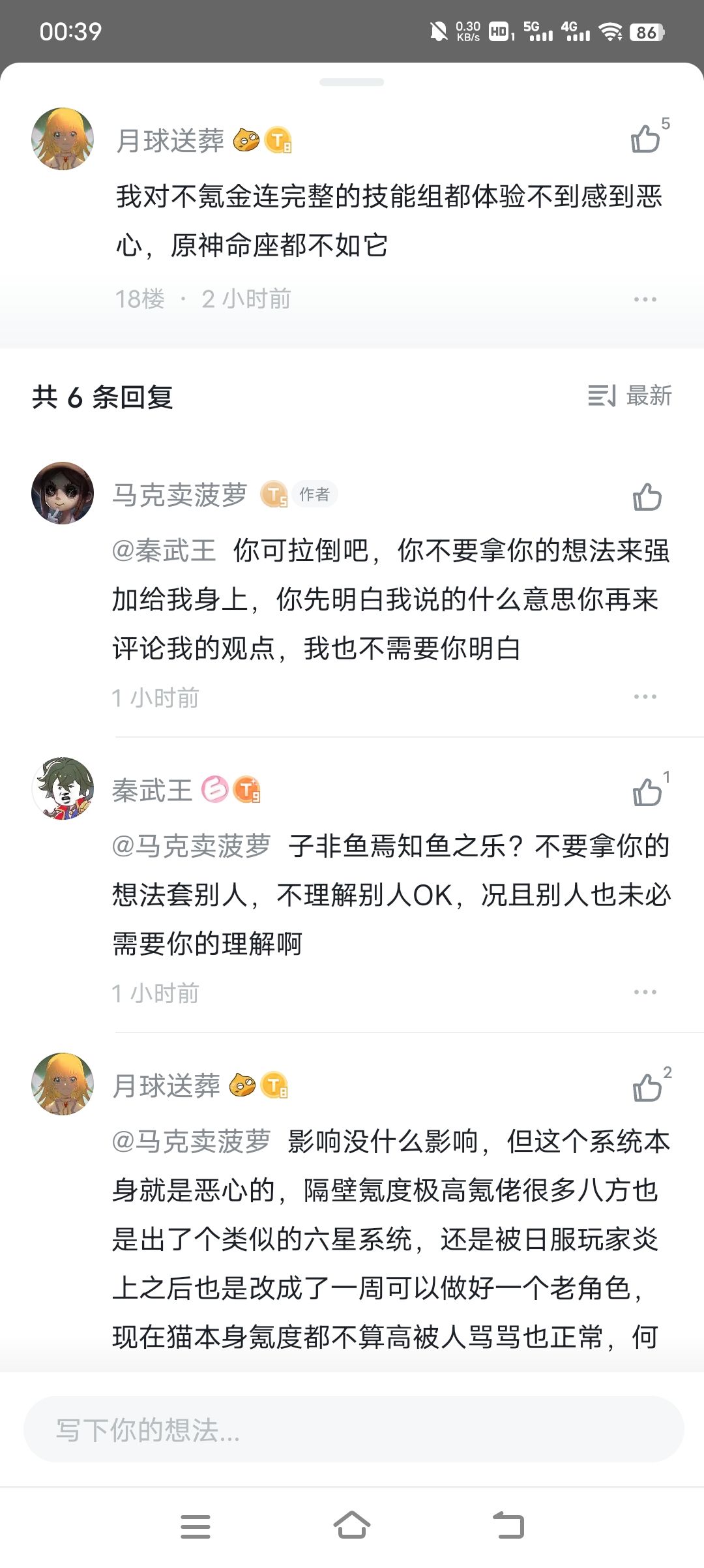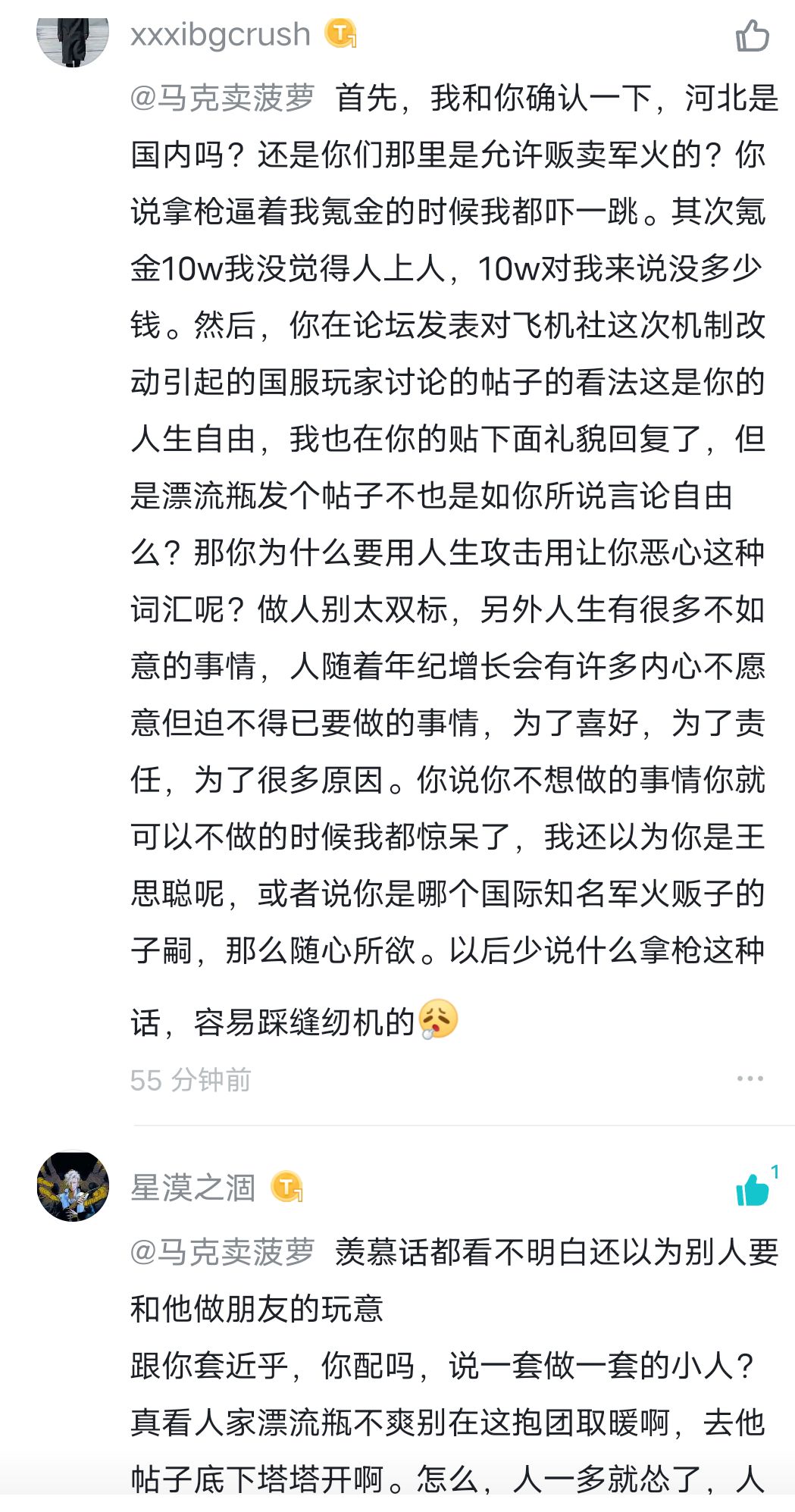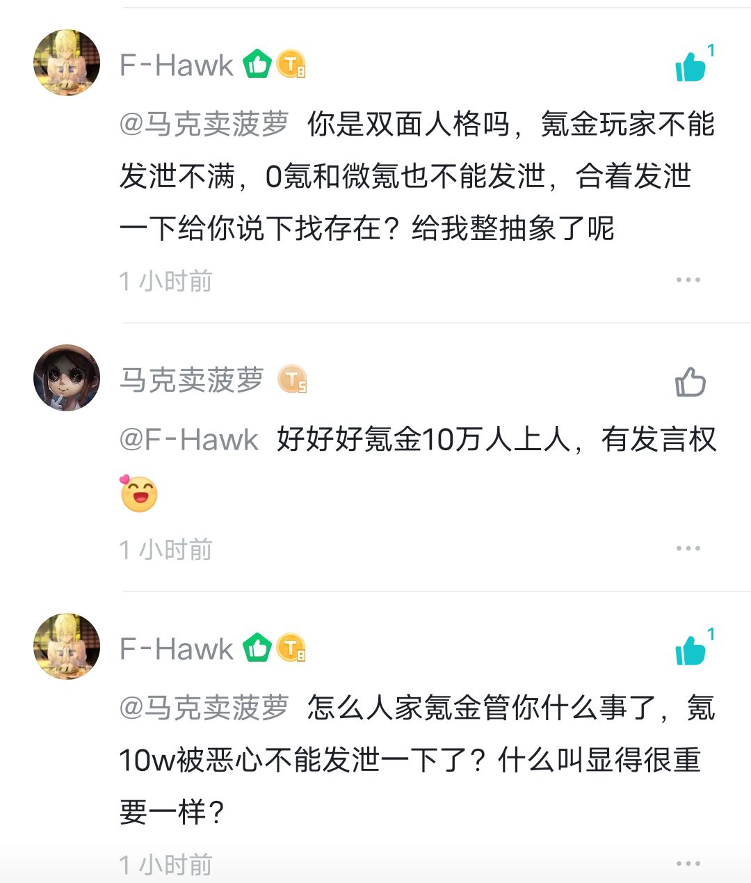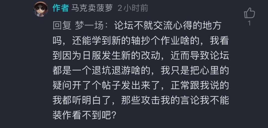 2.大家调侃跑路一说也是发发牢骚,真退游的并不多,这是飞🐴社操作恶心的地方,你不能说你恶心我,我还不能发泄一下。但直接跑人帖子下面去问跑路吗的行为是否抽象?劝人跑路的言论是否合理?甚至问科技是否免费,是要国服玩家跟你一起跑去外服当改子?合理发泄一下是自由言论,消愁言论+直接人生攻击就是()