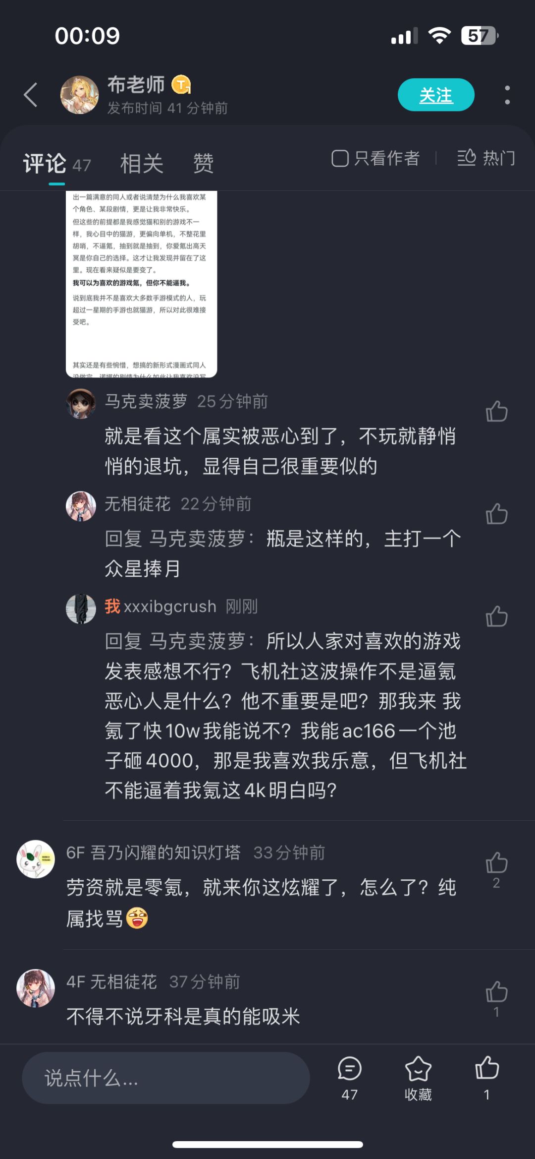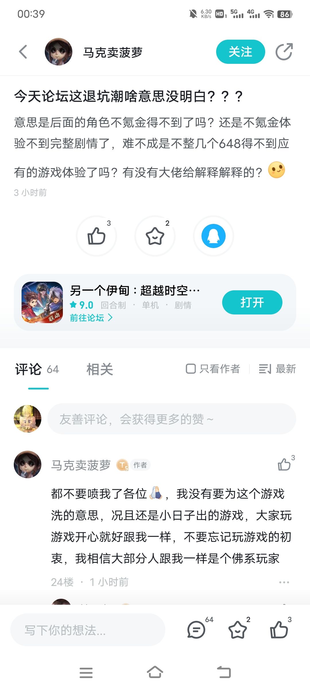 您是佛系玩家,玩游戏开心就好,言论自由,然后瓶的帖子不也是言论自由?直接恶心到您了,但您甚至不敢在人家帖子下面发表您的自由言论,继而转向他人帖子实现双标
