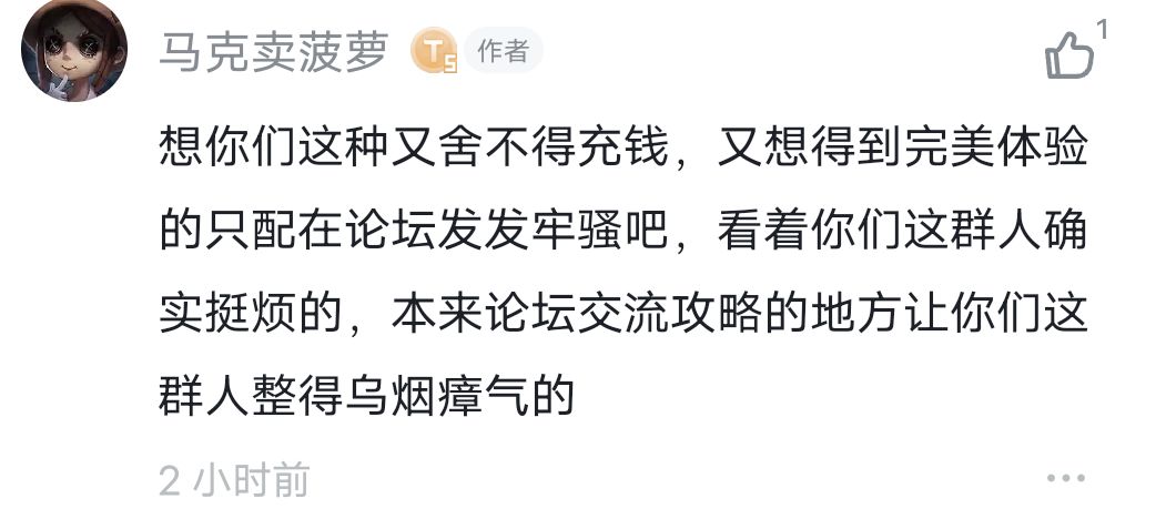 ,一句舍不得充钱的只配在论坛发发牢骚,翻云覆雨,破坏论坛攻略气氛,直接乌烟瘴气,是低配标准轴不合您眼了?还是高配极限轴不屑了?氪金大佬对猫游的作用也不重要了?氪金大佬发发牢骚直接被定义为人上人!只能说这波闪电五连鞭直接秒杀全服0氪微氪重氪玩家,实现真正意义上猫游玩家集体首杀!