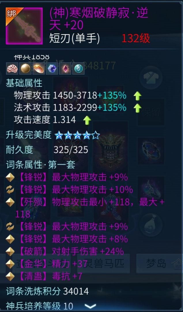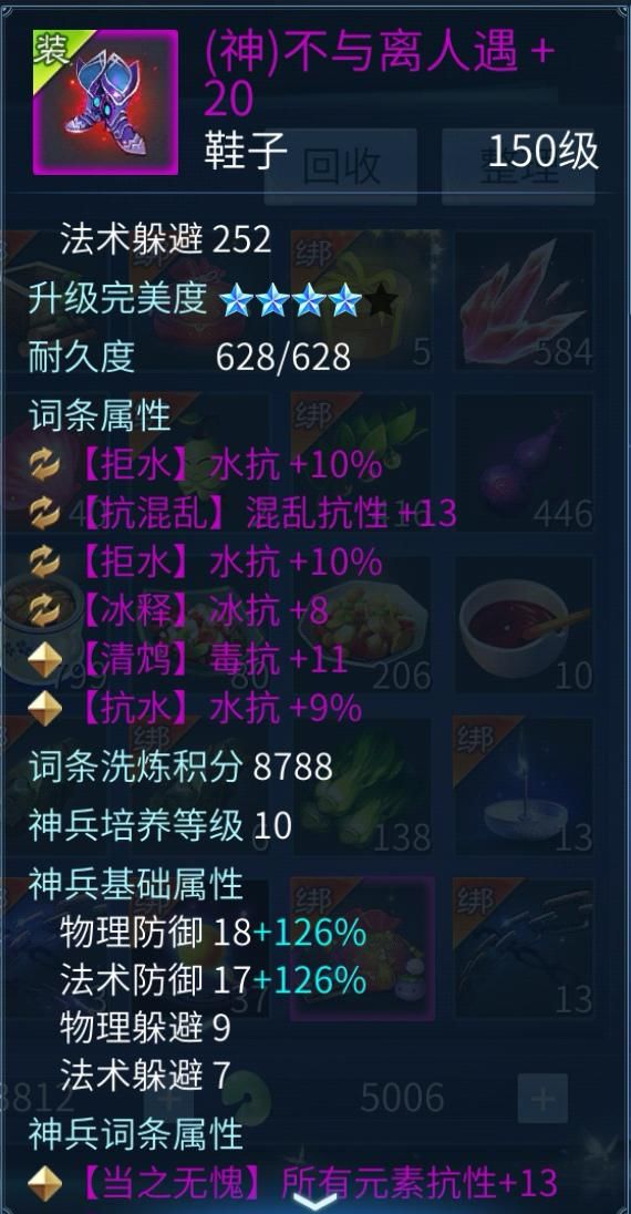 天工阁不仅盛产核武,近期甚至出现了画魂门派最爱的水抗鞋。三条近满分的水抗百分比+一条冰抗,搭配上所有元素抗性的神兵词条,妥妥是行走三界,门派挑战实用“雨靴” 。