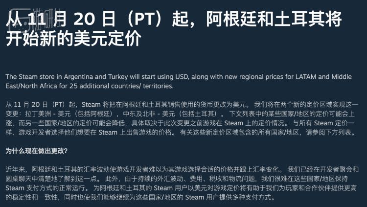 2. Steam宣布取消阿根廷、土耳其的本土货币支付手段,这两个区域将从11月20日起改用美元交易。