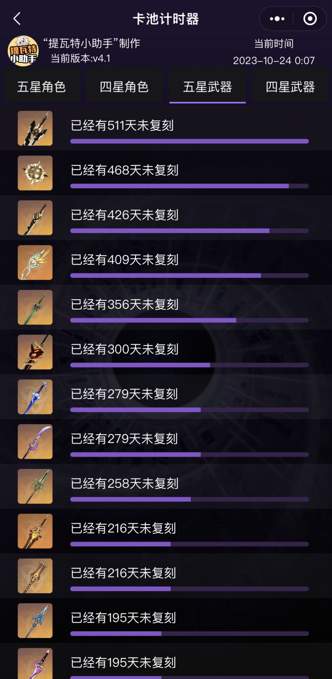 再加上随着限定五星角色越来越多,卡池基本都是两个限五角色双复刻,陪跑五星武器都是他们的专武,那么就很难有机会轮到其他限定武器。在稻妻版本还有过像绫华、宵宫、一斗的单人卡池,到了须弥版本,目前还没有过单人卡池,越往后就越难了。所以我更倾向于,像猎人、苇海信标、盾系列等武器,要等到未来开三卡池的时候,才比较有机会塞到其中某个单人卡池去。