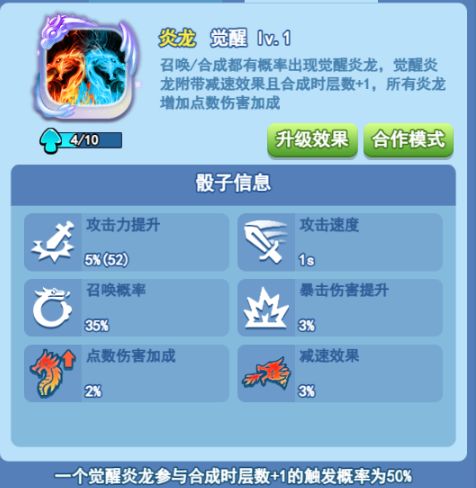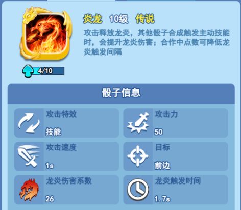 以下这些都可以触发炎龙的被动技能,大家可以按照自己的需求来搭配炎龙,按照实用性来说,支援是最实用的,因为支援合成时是可以额外召唤一个骰子的,如果运气好可以一直召唤支援一直合成,所以玩家在搭配炎龙的时候优先选择支援和招财,其次才是下面这些骰子。