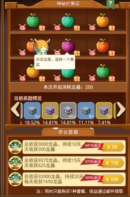 活动内容:活动期间,玩家可以通过消耗龙晶打碎神秘果实获得道具奖励,每轮神秘果实共有9个格子,其中一个格子隐藏大奖,获得该轮大奖之后可进入到下一轮。