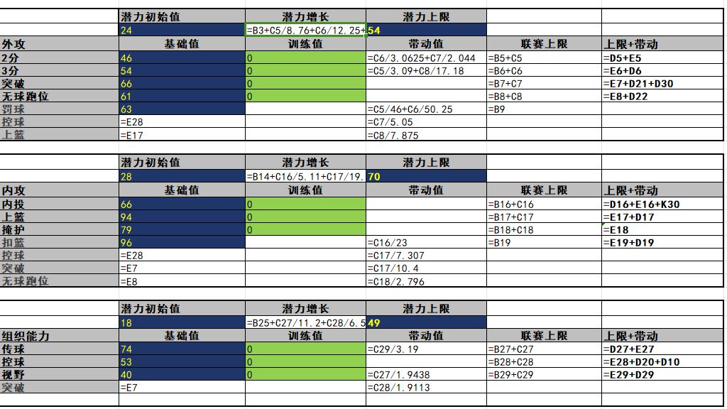 表格中白色框内已输入公式,不要进行编辑或输入数值,蓝色区域黄色数值只需要对应想要计算的球员实际数值输入一次即可,换球员再进行相应改动,绿色区域内的数值可自由编辑,填入数值后,联赛上限一栏会进行自动转化,潜力增长部分也会相应自动转化,联赛上限栏数值变化参考自己的联赛上限即可
