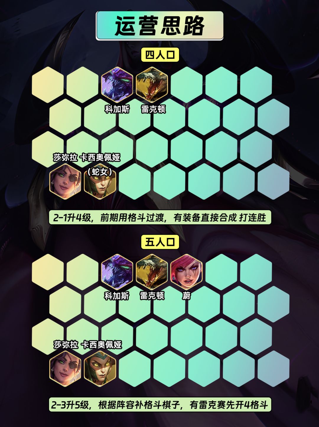 5⃣2-3升5级,根据阵容补格斗棋子,有雷克赛优先开4格斗,后排莎弥拉蛇女选择质量低的先下
