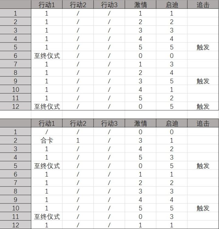 37出牌模拟如图三所示,实际出牌情况肯定会有很大差异,一般分为合卡与不合卡两种情况,不合卡情况下第三次追击会吃到buff,每轮至终仪式都合卡(无论被动主动)能保证追击每次吃到buff,被动合卡情况下会造成一点灵光浪费