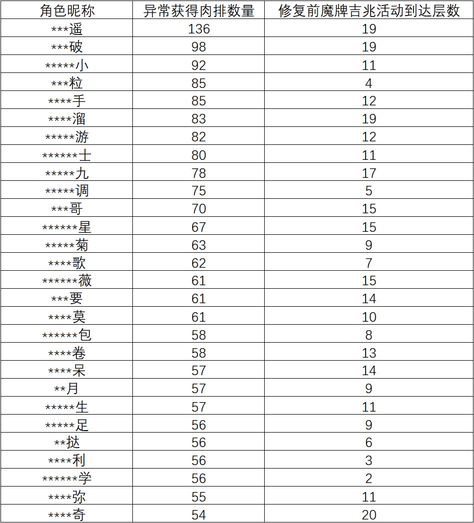 昨天下午,我们得知有小部分队长通过非正常操作超额获得“好大大肉排”的行为,该行为影响了公平友好的游戏环境,因此第一时间关闭了“魔牌吉兆”活动。经过细致的数据筛查,我们对异常获取的肉排进行了处理。以下为异常数量最多的角色相关信息(截止修复前):