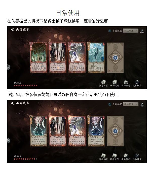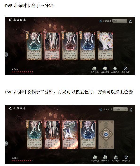 - 下面是一些关于山海残卷的杂谈,残卷输出位青龙只有五色神光青,远程是不好携带的必须贴脸才能打满伤害,玄武位甚至只有一张橙卡主输出收益太低,所以这两个位子的残卷都是默认辅助位处理收益更高,剑仙携带掌上佛国实乃无奈之举,期待官方的更新吧。