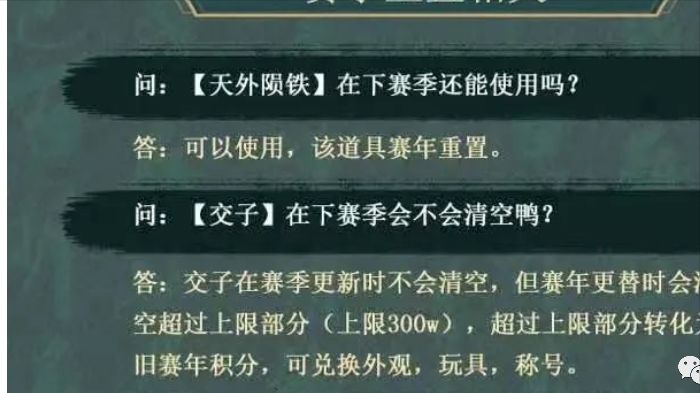 01、赛季更新知识点:1、交子在赛季更新中是不会清空的,在赛年更新(明年6月份左右)只保留300W,超过300W的会自动转化为赛年积分,这个积分可以拿来兑换一下外观、称号、玩具等等各类道具。