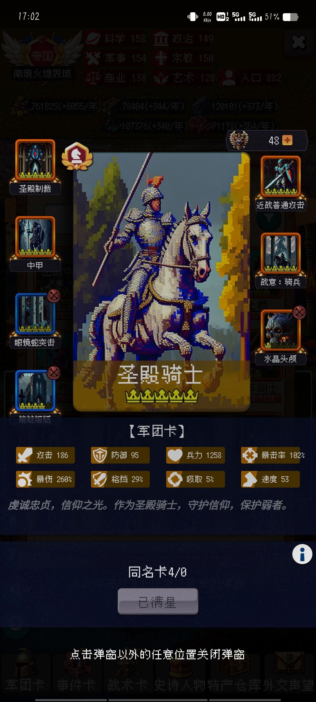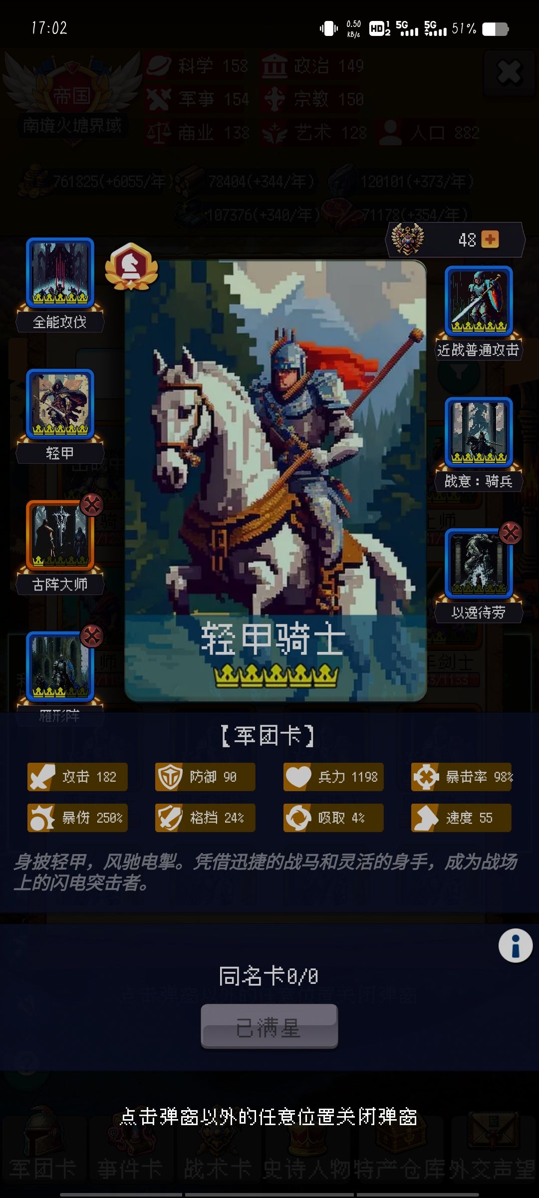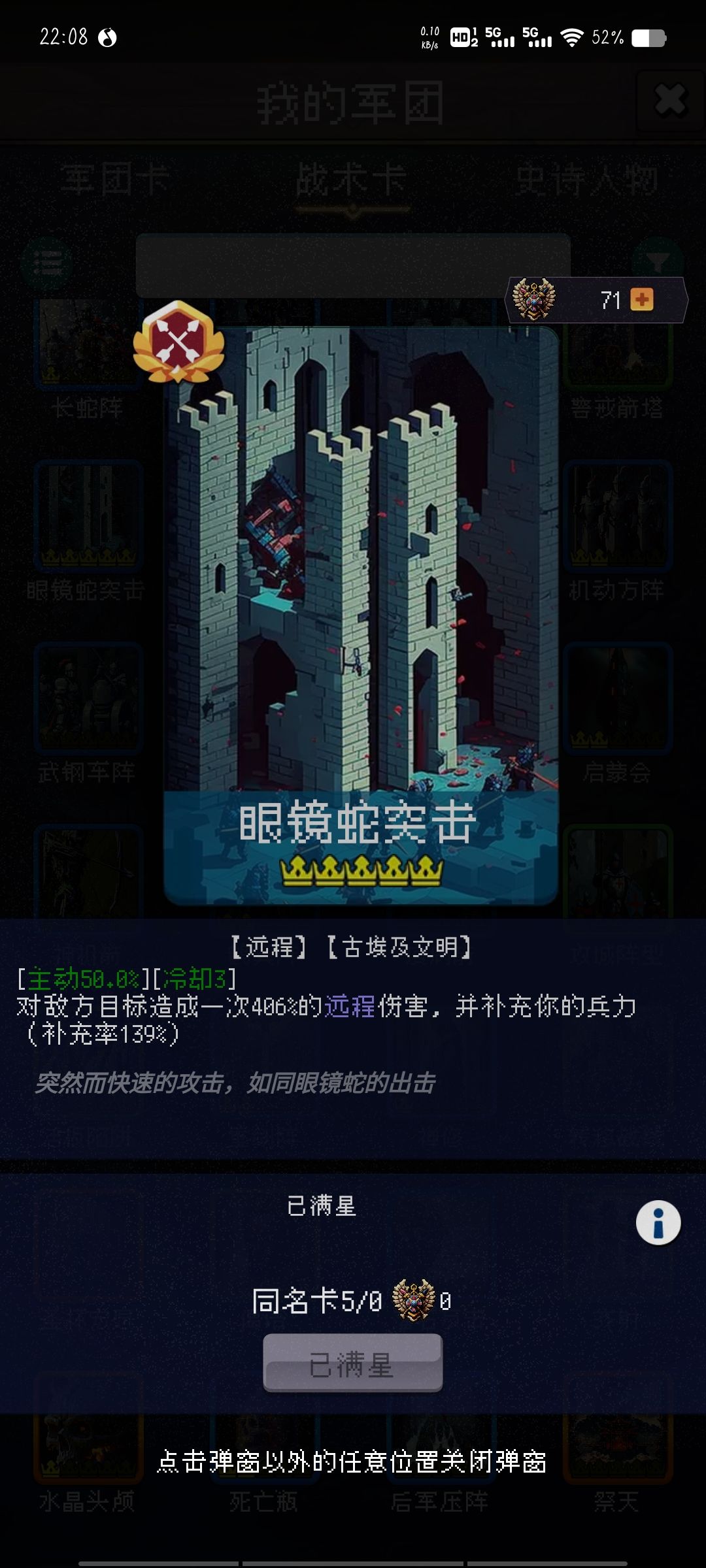 雁形阵骑兵攻击加成+1步兵防御加一无线叠加很有用其他几个也不错可以给古阵大师触发像那种。前方几回合的那种就不要带除非荣耀了这游戏基本上不是克劳都是回合比较久。那个眼镜蛇突击可以刷到五星。然后再带个五星奶商店里看到就拿。有条件的可以氪金魏帝国。拿个八门金锁拿有就拿。一直减对面伤害,每回合出发。那个水晶头颅更是重点。650额外伤害。混乱伤害你可以想象得到。每回合25概率触发真的当赌狗。后面就靠他和那个古镇大师打伤害。然后就是带一个琴骑兵啊。奥奇兵带着眼镜蛇加头颅然后那个免费送的五星骑兵就带古筝大时代那个阵法,然后再带一个以逸代劳。手术医师就带那个八门金锁,然后再加一个望梅止渴游戏里可以拿第二张以逸待劳如果没有的话按眼镜蛇代替。没有八门金锁可以用战争献祭这些主要都是一些战术搭配点赞