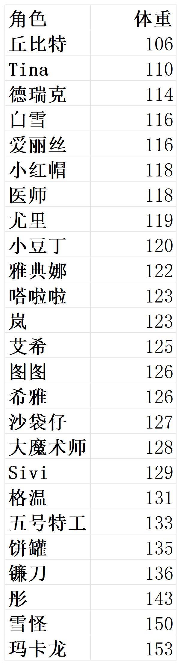 120以下为较轻角色,120~130较重,130以上为重角。