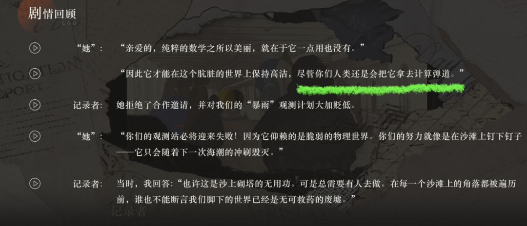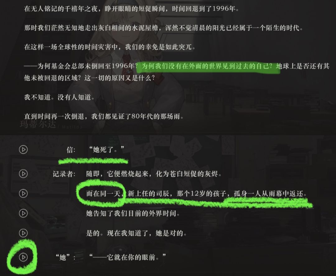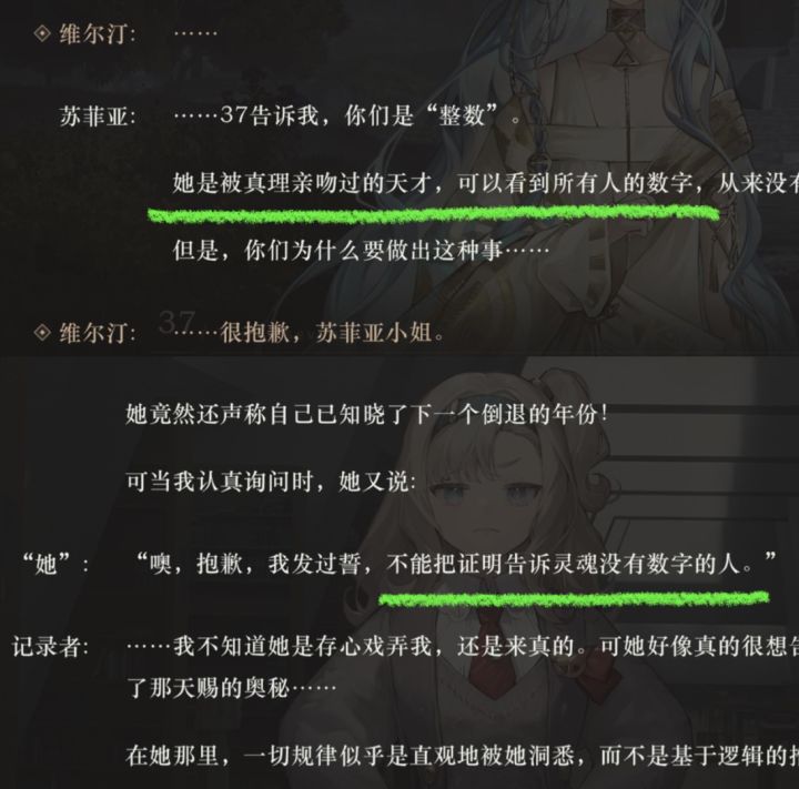 记录者手稿中提到的女学派神秘学家77即为未来的37,即使能靠天赋规避危险,但仍走进暴雨,只为回到“原点”,即初遇维尔汀。目的未知,可能是为了改变某些命运,可能这种主动回溯已不止一次。