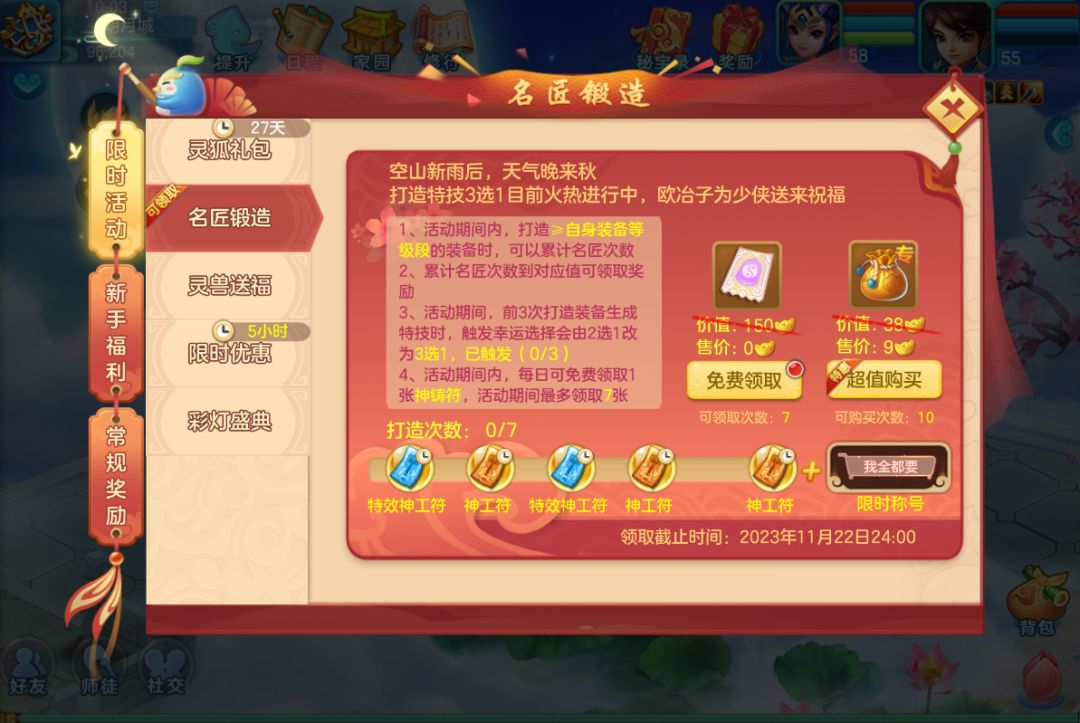 2023年10月26日维护后至2023年11月22日24:00,打造达到一定次数可获得限时神工符与特效神工符。