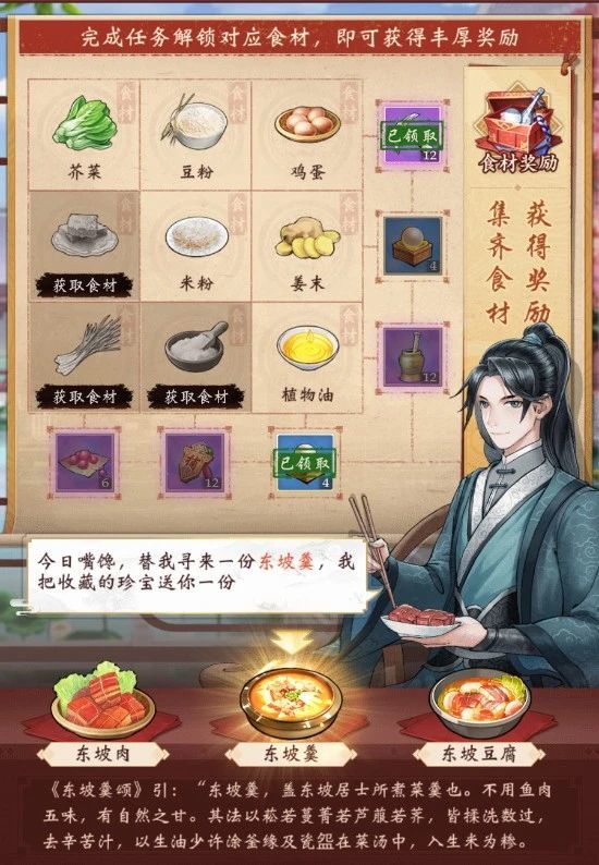 如今,在《少年包青天》游戏中还原了多道苏轼名菜的制作过程,神探们可以通过完成任务去解锁对应的食材,完成相应菜品的制作,还能获取丰厚的游戏奖励哦!