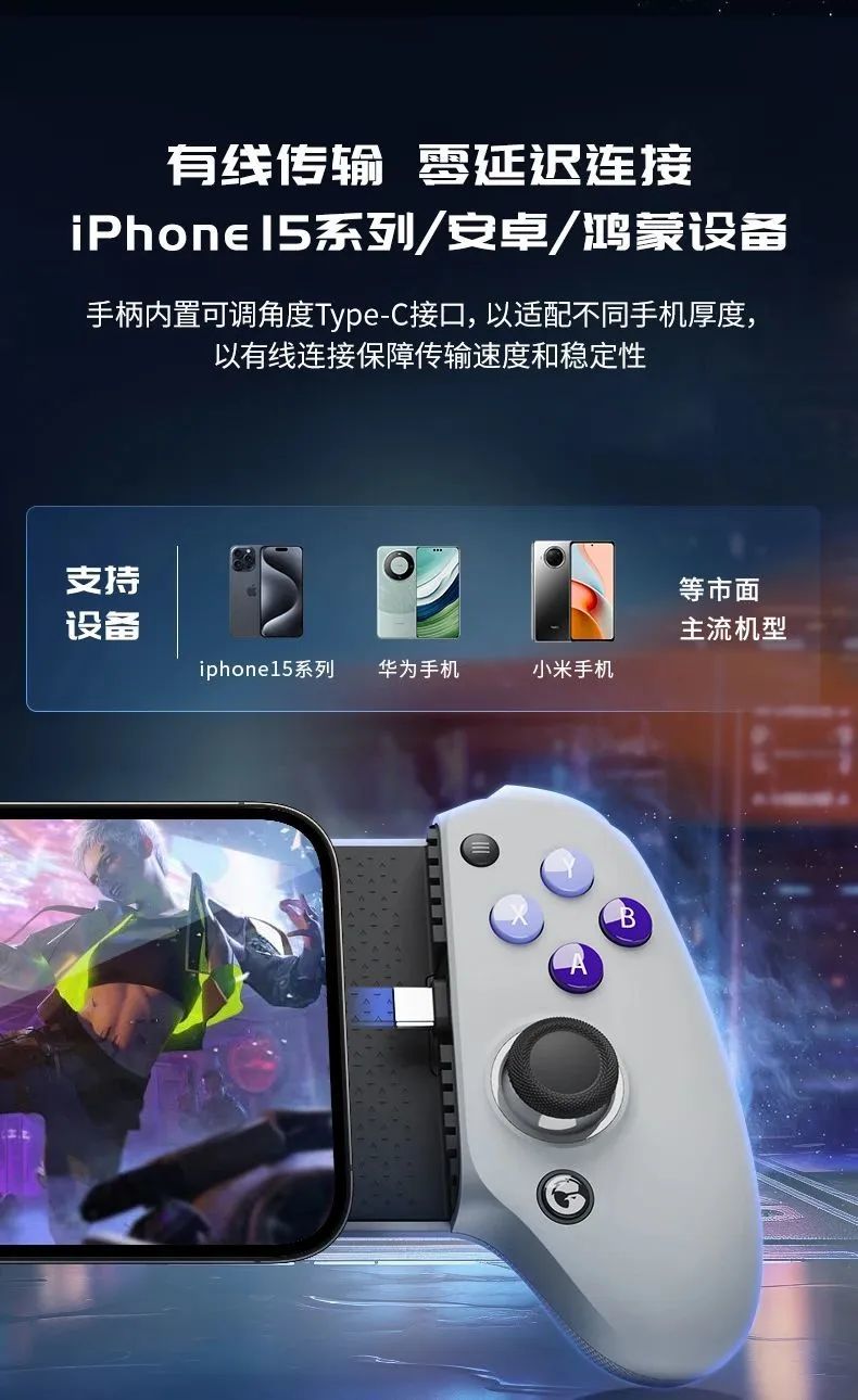 G8射手座手柄采用Type-C有线接口,适配多款包括iPhone 15全系列、安卓和鸿蒙系统的主流机型。