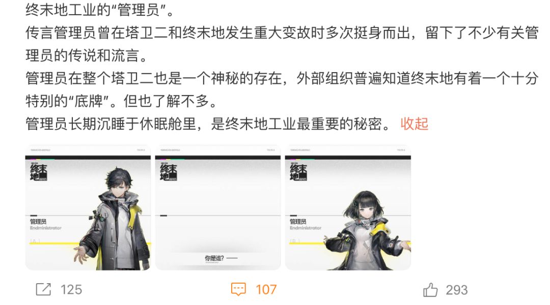 官方社媒有这样的介绍:“传言管理员曾在塔卫二和终末地发生重大变故时多次挺身而出......管理员长期沉睡于休眠舱里。”