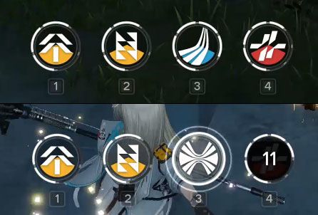 屏幕下方的四个图标分别对应四个角色的技能,每位角色有一个“主技能”,外圈的白色环是大招能量,满了之后原本“主技能”的位置会被大招图标取代,点击就可以释放大招。