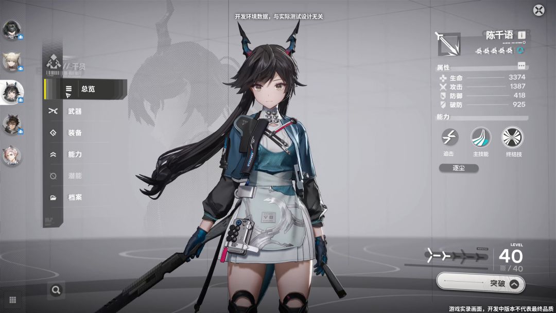 进入角色详情界面,可以看到角色的技能分为追击、主技能、终结技,其中部分角色有不止一个主动技,但是只能选择一个来装备。追击看起来应该是被动技能,终结技就是大招。