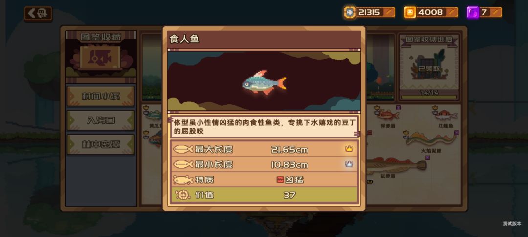 而且鱼的体型大小,也会影响钓鱼的概率。体型越大的概率越低。图鉴中一格长度的鱼为小型鱼,两格为中型鱼,三格为大型鱼,霸主为五格长度