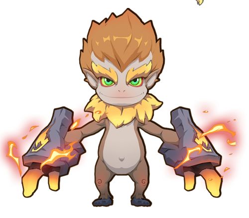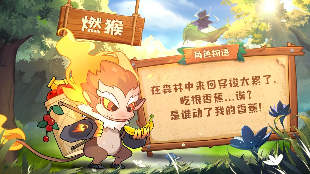 燃猴本只是普通的小马喽,天性活泼好动,凭借着敏捷的身手在丛林间穿梭自如。在森林深处寻得了一双会燃烧的护腕,戴上后可以释放火焰,从此以后便改名为燃猴,并带着它最爱的香蕉和榴莲在幻兽大陆行侠仗义。