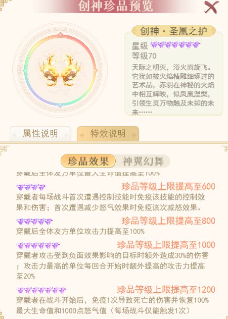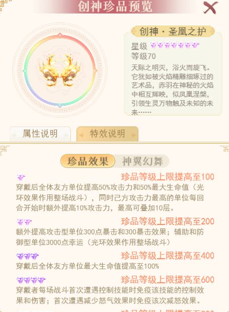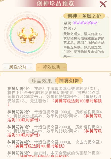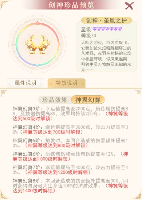 注:创神珍品羽翼的养成与创神珍品功能保持一致
