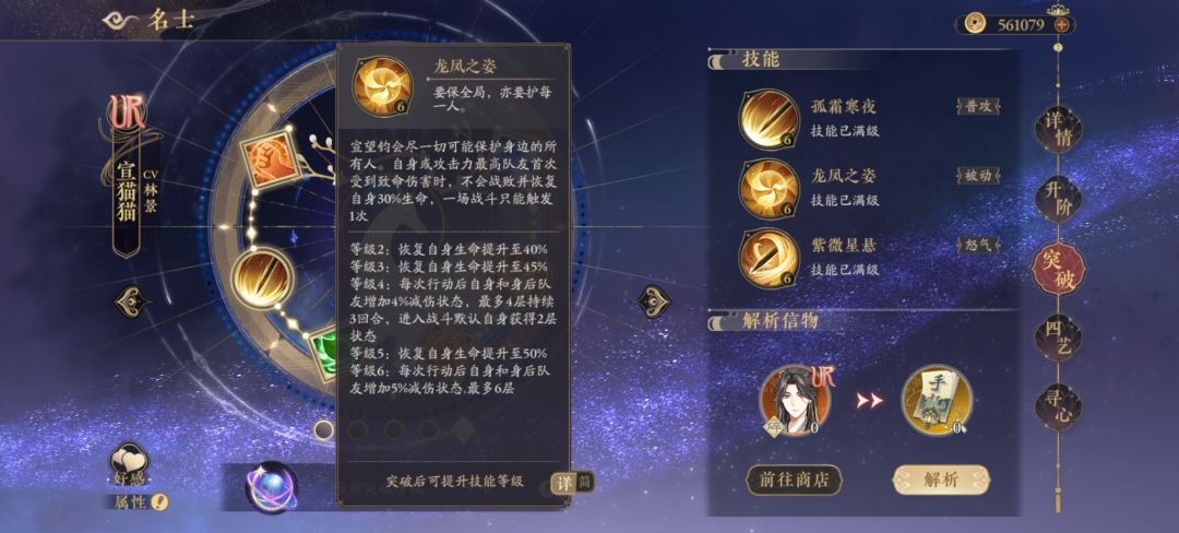 每次攻击后,可以为自己和身后的角色增加免伤,持续数回合,满破之后入场增加两层免伤,永久增加,最高6层,免伤高达30%,直到自己死亡