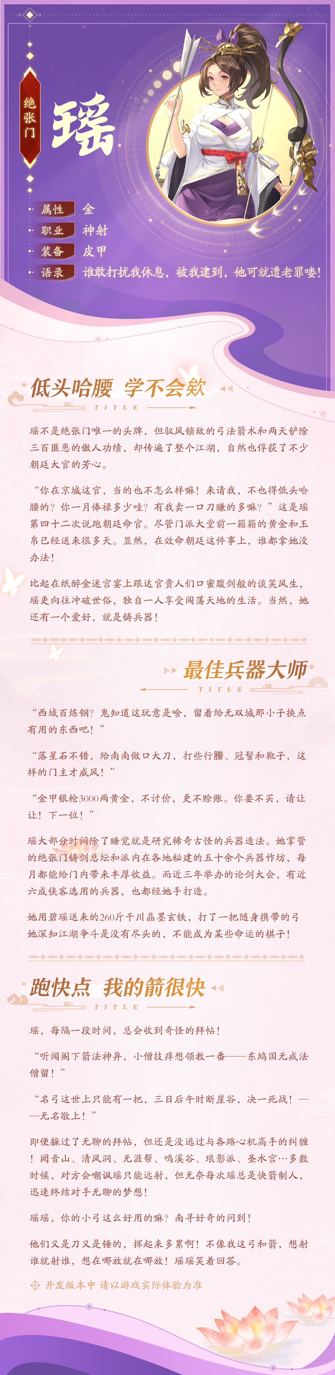她来自江湖大派“绝张门”,不仅弓法精湛,美艳动人,更是各位师兄师姐闯荡江湖的好搭档!