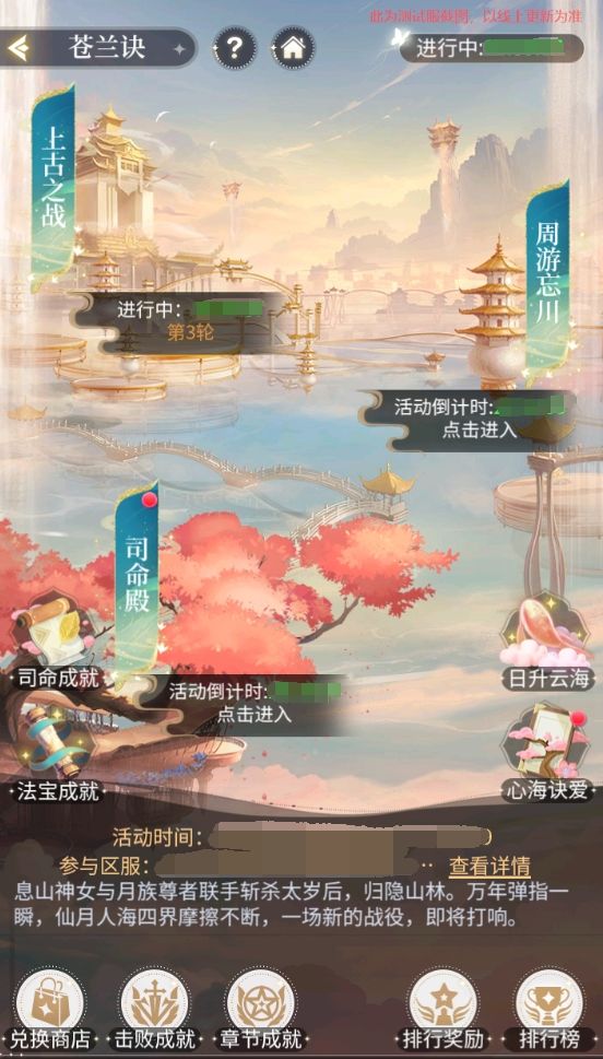 活动分为司命殿、周游忘川、上古之战三个玩法