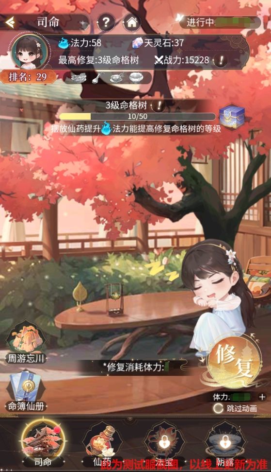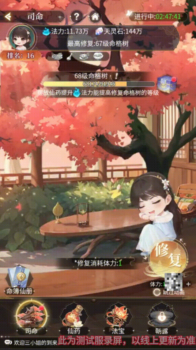 活动期间小兰花消耗体力对命格树上的命簿进行修复