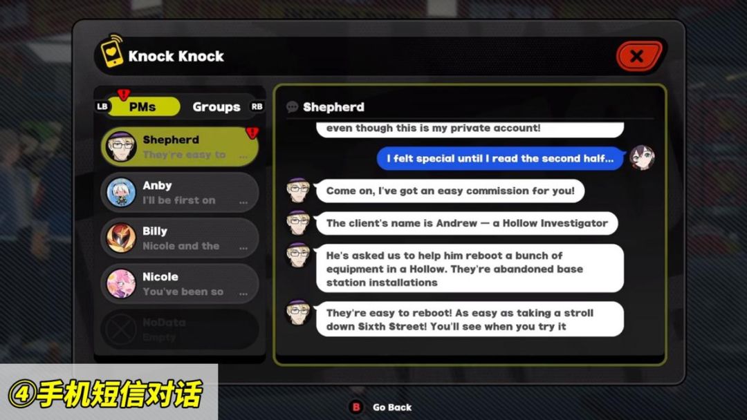 ④手机短信对话。不少二游都有这方面设计,相较于简简单单的街边对话,这种短信隐私方式的对话,会让玩家与角色或NPC之间的情感显得更亲密一些,代入感也更强。