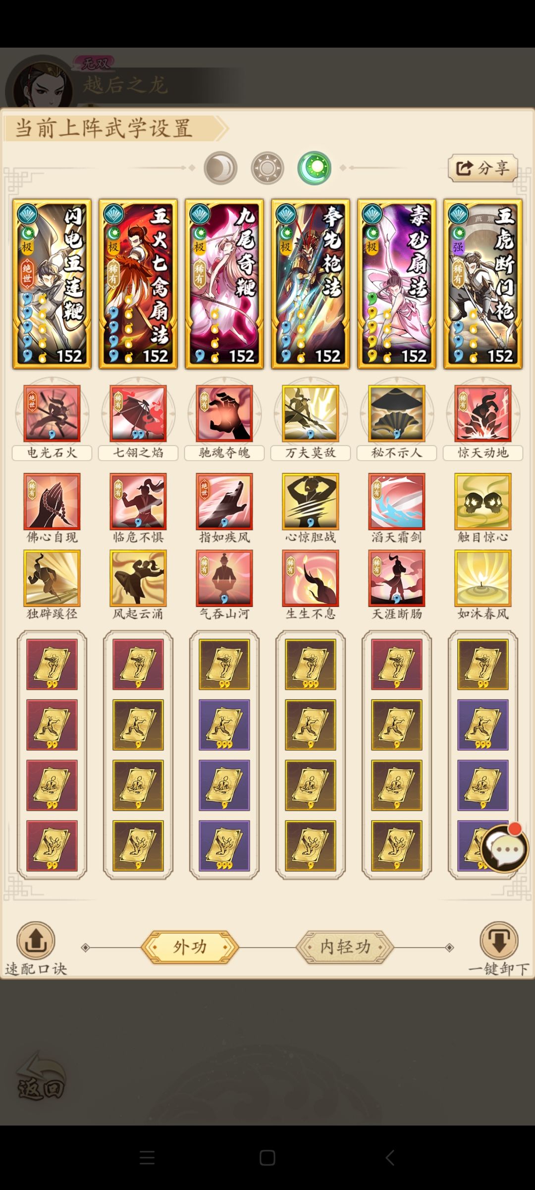 说下心愿的选择,普通心愿毒沙扇法,普通轻功内功,先觉身法抽到快黄勾,选金钟罩,轻功是保证聚气,内功是增加攻击,加强伤害。稀有心愿五火七禽扇法,绝世怼闪电五连鞭,这套调和奇不需要问鼎苍穹和大彻大悟,所以直接怼闪电五连鞭就行,作为单体输出最爆炸的绝世,勾度决定了你的上限!!!我武库,心愿全整的闪电五连鞭,现在7本闪电五连鞭,3本游龙八卦步,1本燃木刀法,靠这个思路,可以追一下主力输出卡的勾度。因为别的氪佬需要开招式,所以勾度不一定比我们只怼一张绝世厉害。这就是前期的优势。