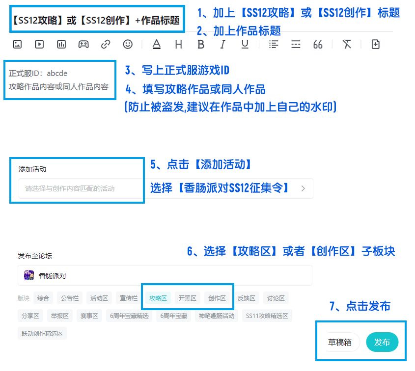 2. 攻略作品需要在标题中带上【SS12攻略】或【SS12创作】的字样;同时也不要忘了给自己的作品加上【作品名字】并在文中留下作者【正式服游戏ID】,最后选择【攻略区】或【创作区】子版块进行发布~