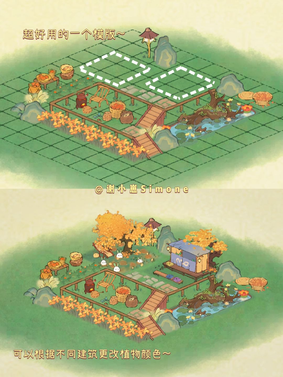 搭了一个晾晒柿子的小台子(这个景其实与下雪天更配,P了一张雪景~hh)台子的模版很万能,搭配娱乐、生产建筑皆可,手动改改植物小家具的颜色就行。