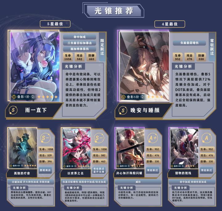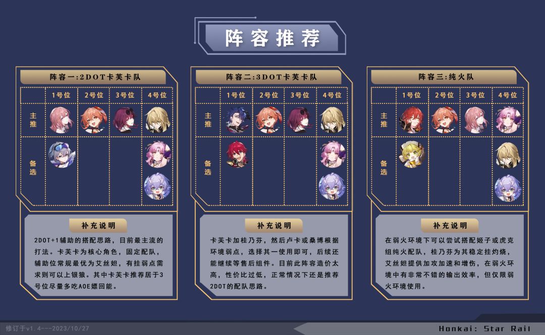 卡芙卡为核心角色,固定配队,辅助位常规最优为艾丝妲,有挂弱点需求则可以上银狼。其中卡芙卡推荐居于3号位尽量多吃AOE嫖回能。