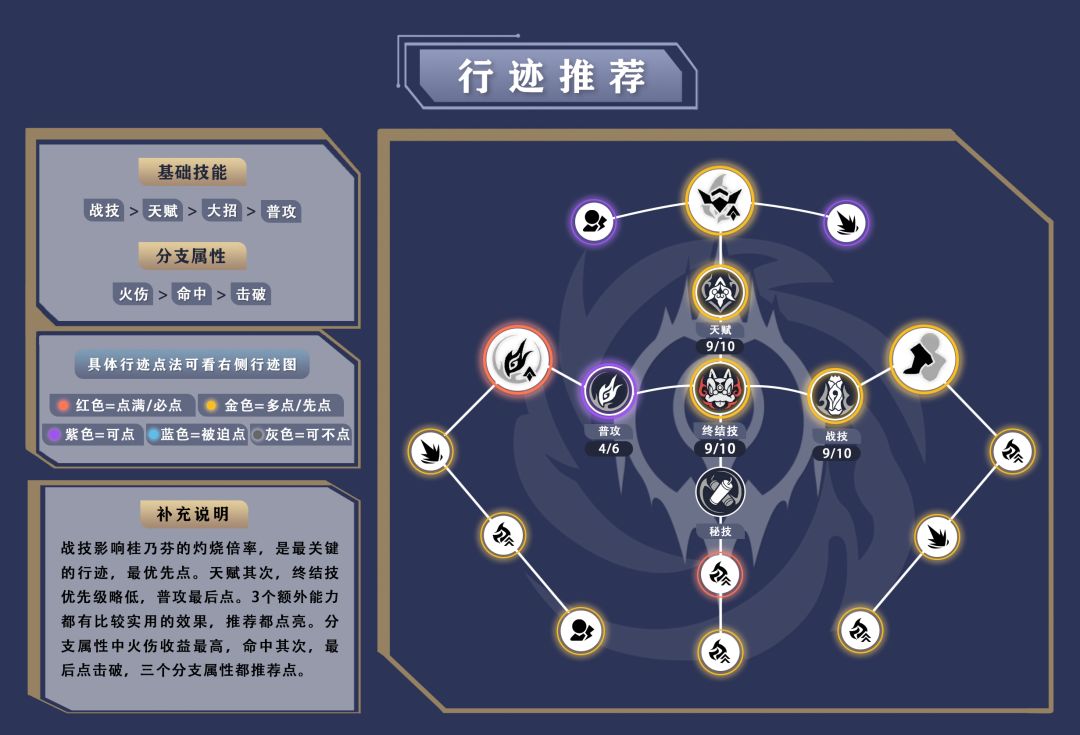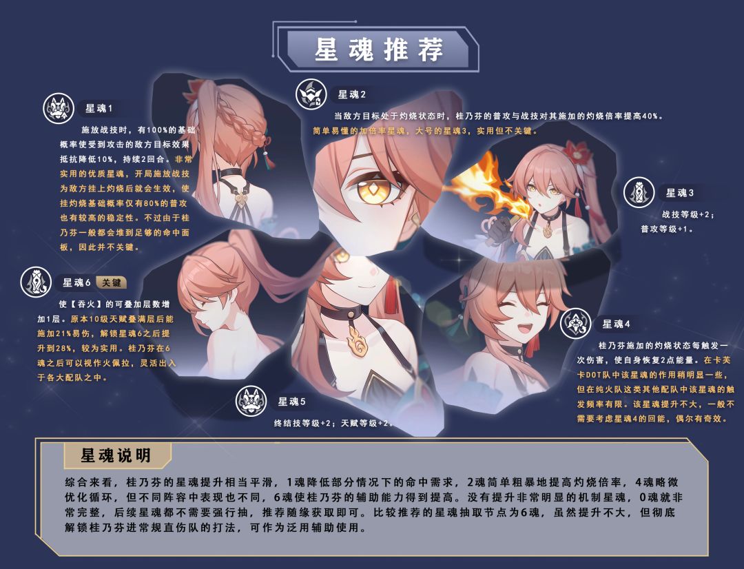 桂乃芬的配队思路和她的侧重点有极大关系。依靠桂乃芬挂灼烧的DOT能力,可以和卡芙卡组出DOT队,作为弱火环境的最优组件;依靠桂乃芬天赋挂易伤的能力,可以和姬子、虎克等火C搭配使用,为其提供稳定的灼烧和优质的BUFF。