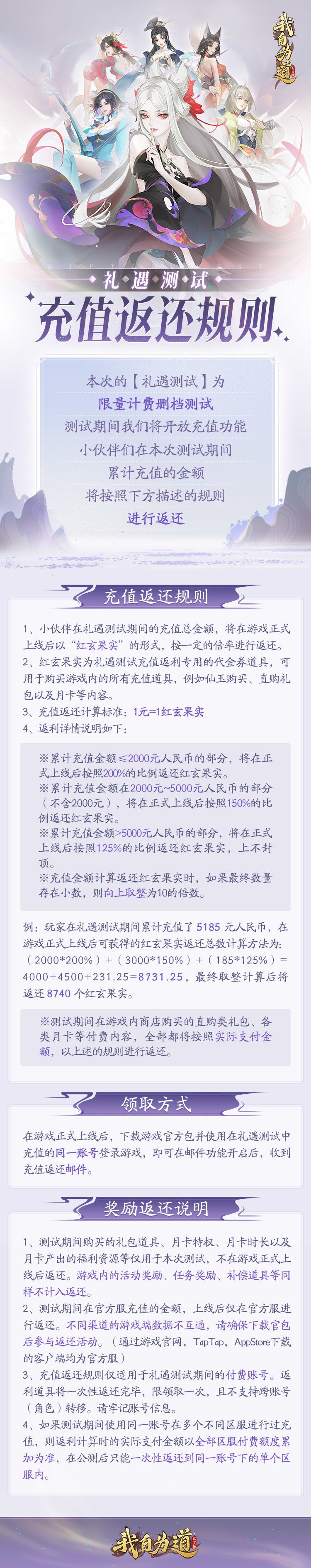 本次「礼遇测试」为安卓限量计费删档测试,测试期间开放充值功能。您在测试期间累计充值的金额将按照图中公示的规则进行返还,请各位阅读并知悉。