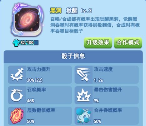 首先我们来看一下觉醒后动的属性,觉醒后的黑洞吞噬时是又概率获得层数翻倍的,且自身合成时又概率吞噬目标骰子,这里说的吞噬指的是黑洞吞噬黑洞,也就是说,黑洞觉醒后,不仅在吞噬的时候有概率翻倍,还可以吞噬自己,这对于需要层数的黑洞而言,可以说是史诗级加强,这也是为什么黑洞可以一直保持在竞技场顶端的原因。