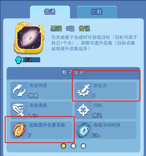 而未觉醒的黑洞,我们看看他的属性,下面用的是九级黑洞,攻击力只有9点,吞噬每层提升伤害的系数也只有7点,也就说玩家前期必须要要依靠其它骰子打输出才可以存活下去,不然前期就容易暴毙,且因为每次吞噬的层数是固定的,那么到了中后期一定会有乏力期,一旦吞噬的层数没有小怪的强度高时,就只能输掉比赛了。