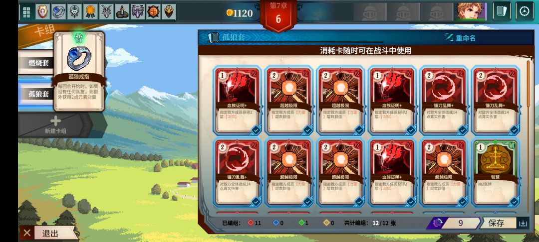 孤狼镰刀流简直高效又无敌,核心是超越极限加孤狼四件套,嗯,然后再带把刀。开局后可以靠着孤狼的特性疯狂刷牌,因为力量层数不会消失所以可以快速叠到九九九,超越极限可以让力量成倍增长,因为镰刀是群体真伤无视护盾,数回合后群伤数百可以秒天秒地,带几个汲取既可以过牌又可以在战斗结束自动满血。什么队友技能还需要一个个触发,一回合时间愣是被那三个女人拖延的巨久,又慢又浪费时间,用这套闭着眼睛打,到后期根本没有对手。至于有清除增益的BOSS没办法将力量叠最高层数,既然你不让我快乐那就直接打呗,每回合可以砍他几十甚至上百的血,运气再好点说不定一轮就把他秒了。所以快来一起享受一刀清屏的快乐吧。