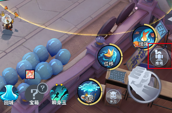 具体判定规则如下:自己不在塔的射程内,且自身附近50码内有宝箱怪的时候,推塔的按钮会自动替换为“攻击宝箱怪”按钮。其余情况仍旧为“推塔”按钮。