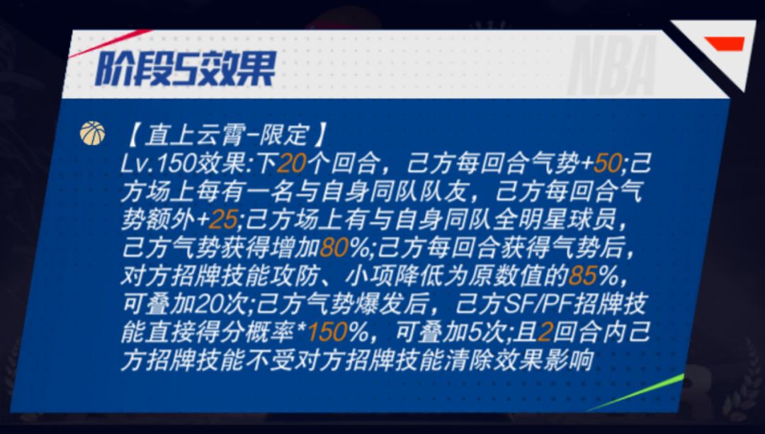 直上云霄-限定:下X个回合,己方每回合气势+Y;己方场上每有一名与自身同队队友,己方每回合气势额外+Y;己方场上有与自身同队全明星球员,己方气势获得增加X%;己方每回合获得气势后,对方招牌技能攻防、小项降低为原数值的X%,可叠加20次;己方气势爆发时,己方SF/PF招牌技能直接得分概率*X%,可叠加5次;己方气势爆发后,Y回合内己方招牌技能不受对方招牌技能清除效果影响。(预计在上线同时开启迈向巅峰)