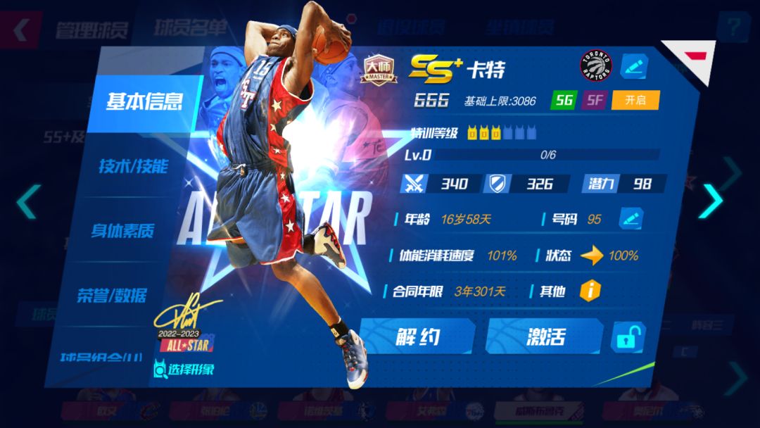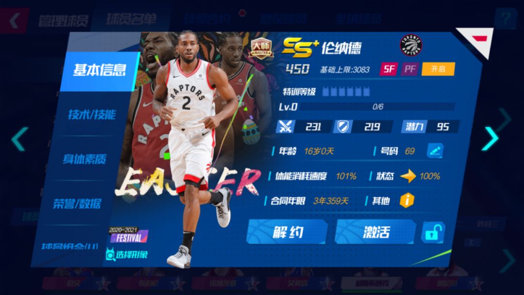 招牌技能铜浇铁铸-限定:下X个回合,自身助攻+X%;若己方招牌技能生效数大于2,己方猛龙队队友招牌技能得分概率*X%;双方全队体能消耗速度+X%。(预计在上线同时开启迈向巅峰)