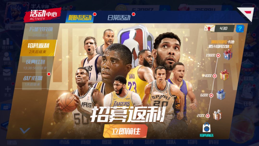 活动期间,将累计经理人在【限定招募】卡池的招募次数,招募次数到达198抽后即可领取新增的球员三选一礼盒,可选限定猛龙洛瑞(新增大师)、克里斯波什、伦纳德,奖励中包含巨星介绍信,可用于在招募商店中兑换限定球员。招募返利活动结束后,招募商店和巨星介绍信均会保留,经理人可随时进行兑换。
