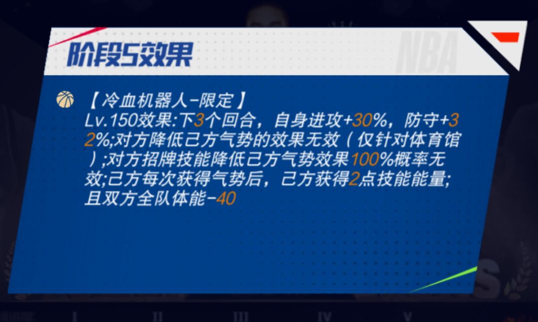 冷血机器人-限定:下X个回合,自身进攻+X%,防守+Y%;对方降低己方气势的效果无效(仅针对体育馆);对方招牌技能降低己方气势效果X%概率无效;己方每次获得气势后,己方获得Y点技能能量,且双方全队体能-X。
