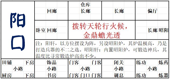 - 昭阳轩:不可拆除重建,建议炼器放旁边,要不老实爬地图淬如意。