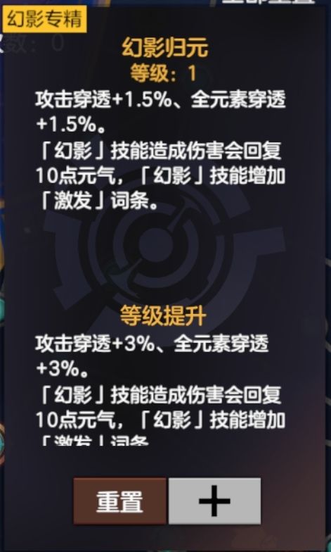 【归元】减少每次释放技能的元力消耗,【虚影决】给技能附加(幻影)词条,【幻影归元】因为技能附加了幻影词条,所以现在每次攻击都能回元气
