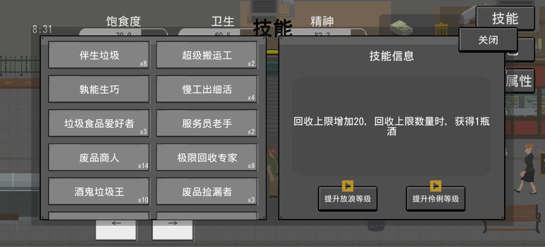 前期要多备些吃的,很容易饿死,小卖铺的东西比商店便宜,有钱可以多囤一些(汉堡披萨性价比高一点);睡觉尽量去救助站(20点之前到),实在来不及就住宾馆,尽量不要露宿街头,可能会被打劫(遇到过,背包抢空了都,钱不会少);升级技能很重要,想做打工人就多升级工作技能,想摆烂就升级回收品相关的,乞讨运气好可以要很多钱,但是我经常被拒绝😢
