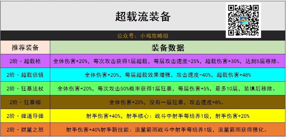 推荐角色:射手(量子先驱,每获得一件超载装备,伤害增加20%),刺客(弯刀王子,每获得一件超载装备,伤害增加20%)法师(黑魔导,技能可以分裂,适合清怪)